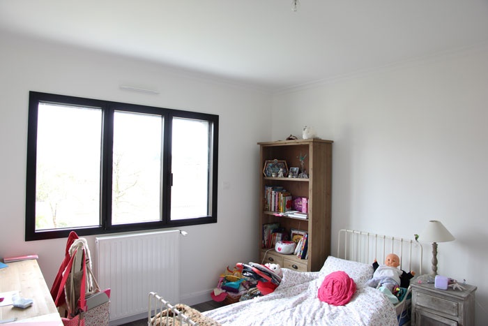 Deux grandes chambres, une salle de jeux et une salle de bain sont dessinés et réalisés. L’ensemble de la surélévation en zinc se déploie de toute sa hauteur côté jardin et conserve une forme de pente plus douce côté rue.