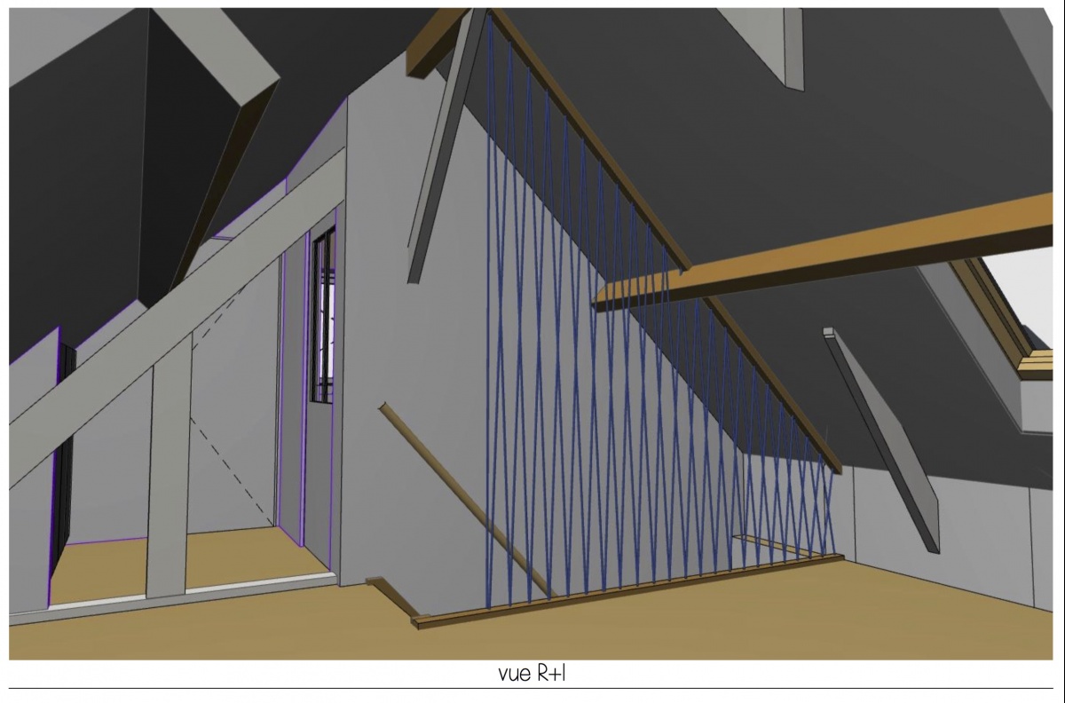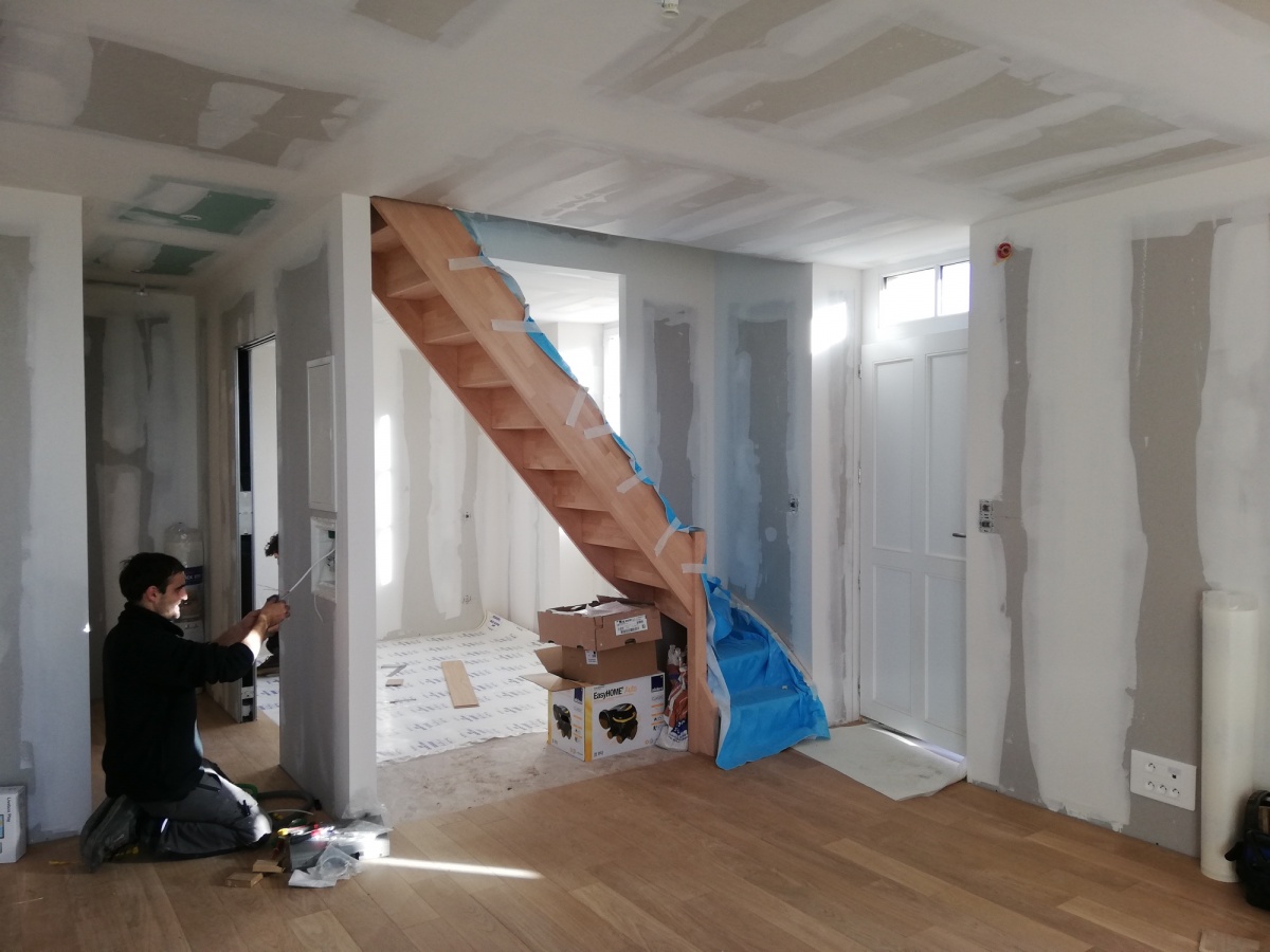 Une démolition totale des intérieurs, compris planchers, nous a permis de traiter et d'assainir la maison (présence de remontées d'humidité et de mérule). Une fois les planchers repris à neuf ou renforcés, le nouvel escalier et le cloisonnement des pièces a redistribué la maison: 3 chambres, un palier, une salle de douche, 2 WC et une pièce de vie/cuisine ont pu être créés. De nombreux rangements sur mesures et intégrés permettent d'optimiser les espaces. Un garde corps en cordage sera mis en place pour un style balnéaire. Dans un dernier temps, le ravalement redonnera ses couleurs à la maison en ajoutant une pointe de bleu.